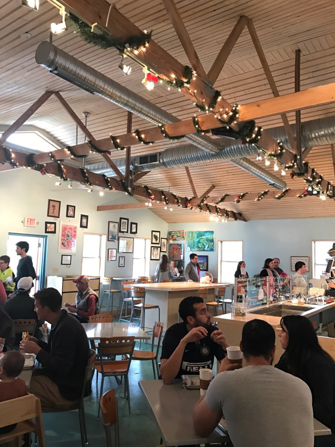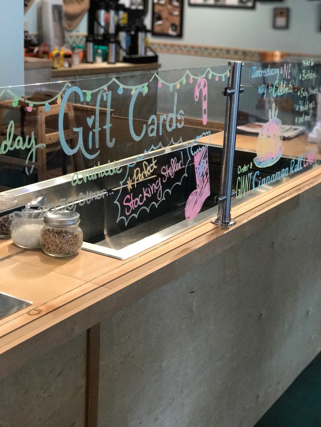 Cinnamon Roll Deli was so, super busy when we arrived and it never died down in time for me to get photos of the “cinnamon roll bar”! So let’s use that as a way to make you want to go and see what’s it all about! But I did score this photo of the inside area! Notice the artwork on the wall! It’s from local artists and all of the items are for sale. What an awesome way to support local artists!