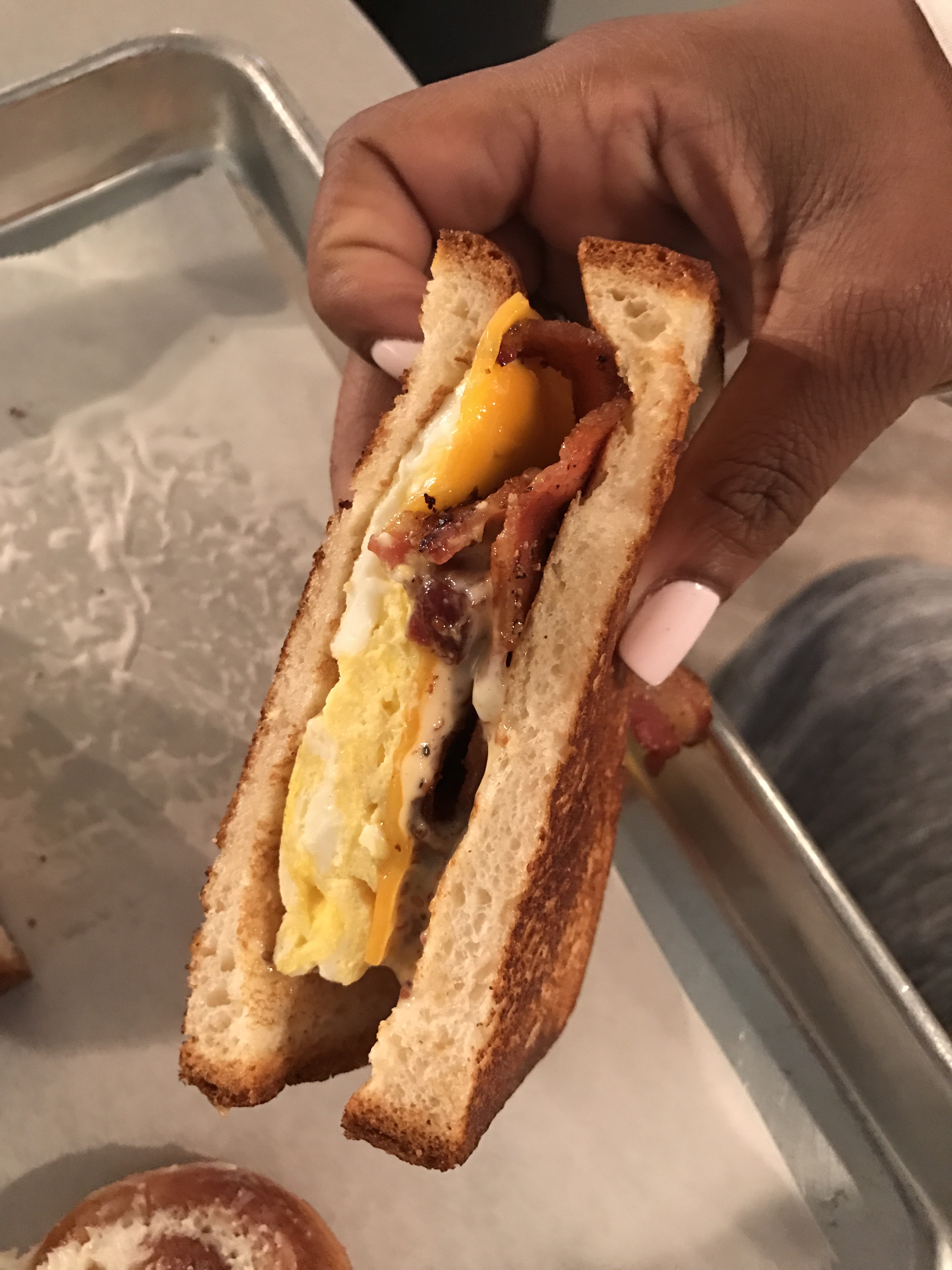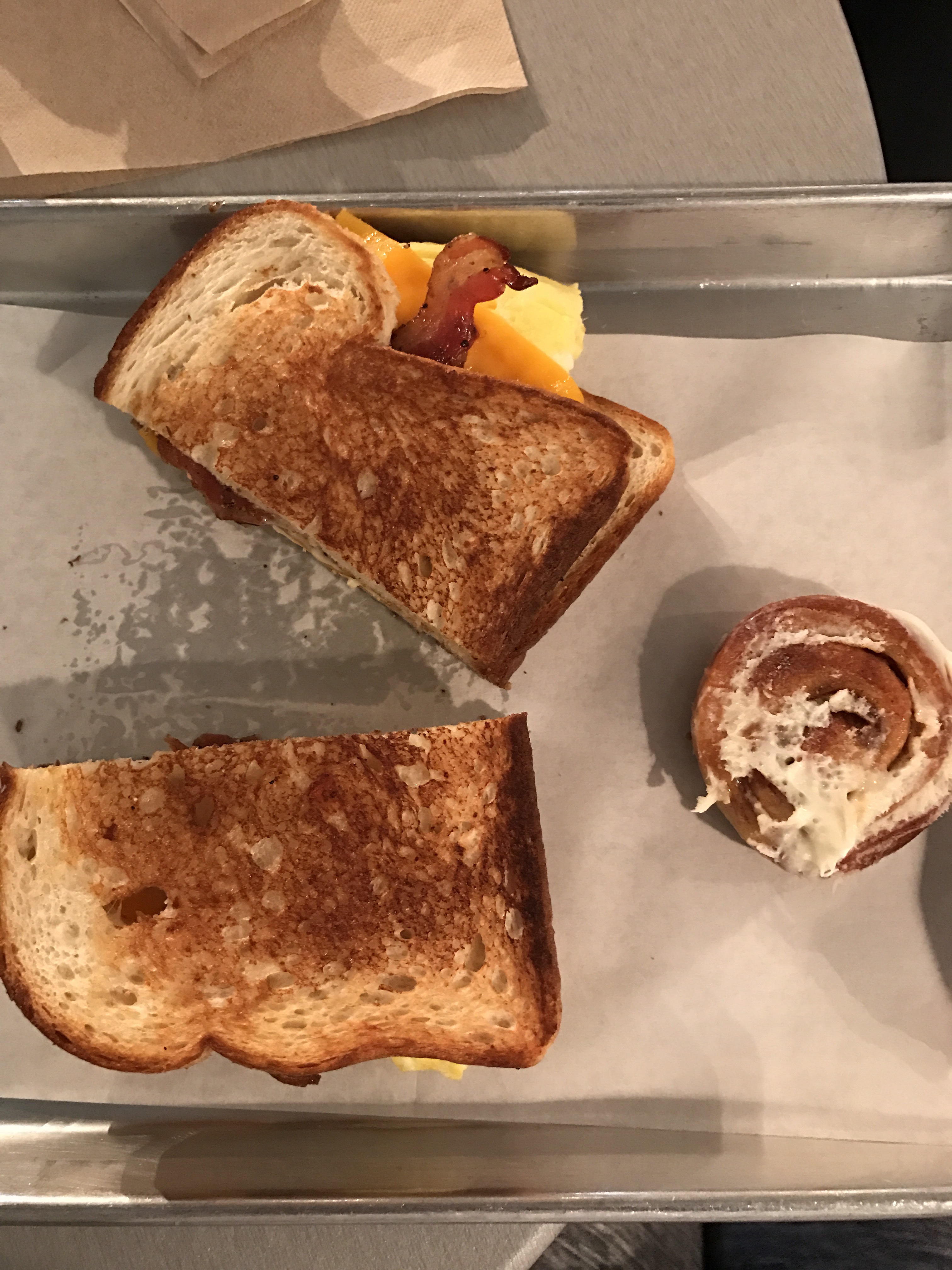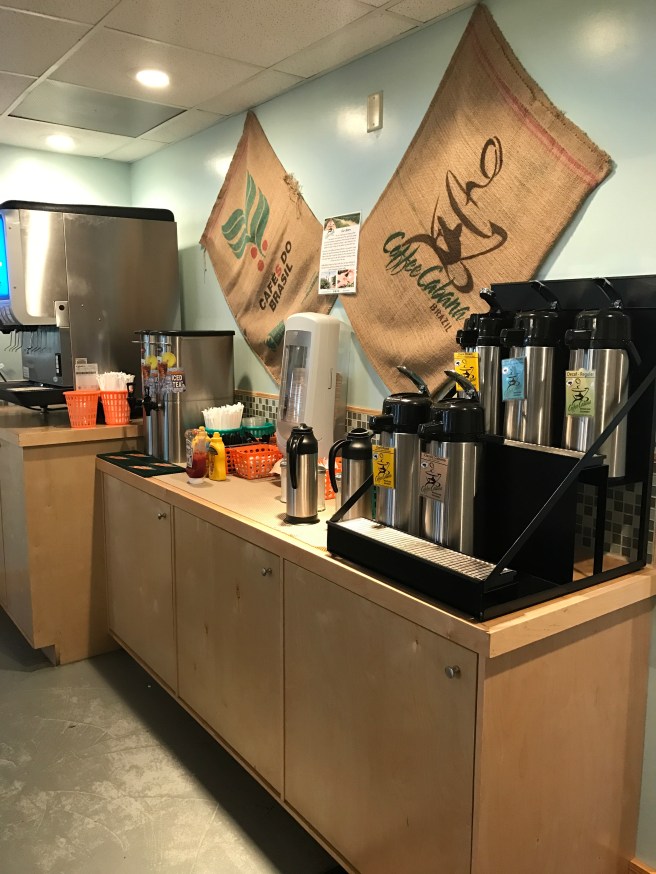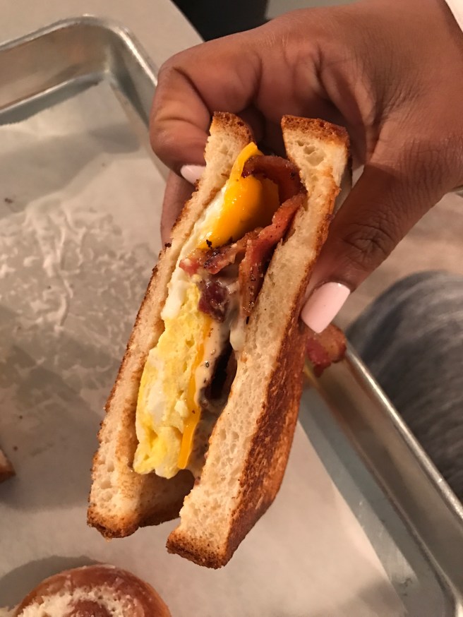 Talk about a treasure of yummy deliciousness! Oh. My. Goodness! We were fortunate enough to catch them before they stopped serving breakfast to begin switching over to their lunch menu! I would compare their food to Panera but waaaay better. It’s almost like comparing Embassy Suites to Trump Towers! (Just my interpretation. Both are good, but one is better!) It’s presented in the most simplistic way and get this…with every single breakfast sandwich you get a FREE miniature cinnamon roll. I have never had so much goodness at once for breakfast. See my meal below!