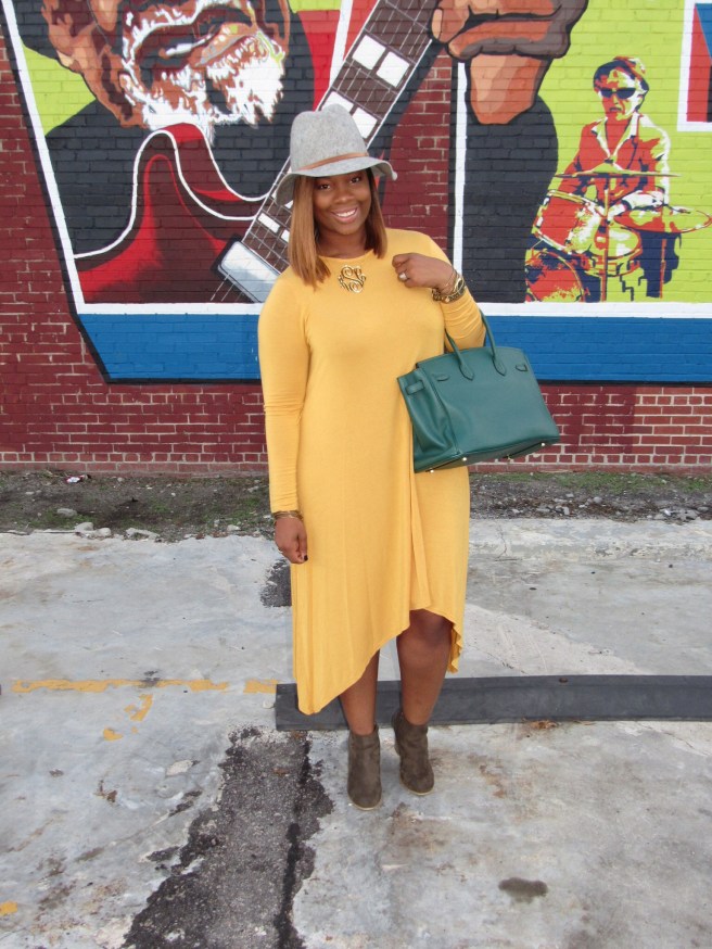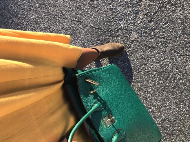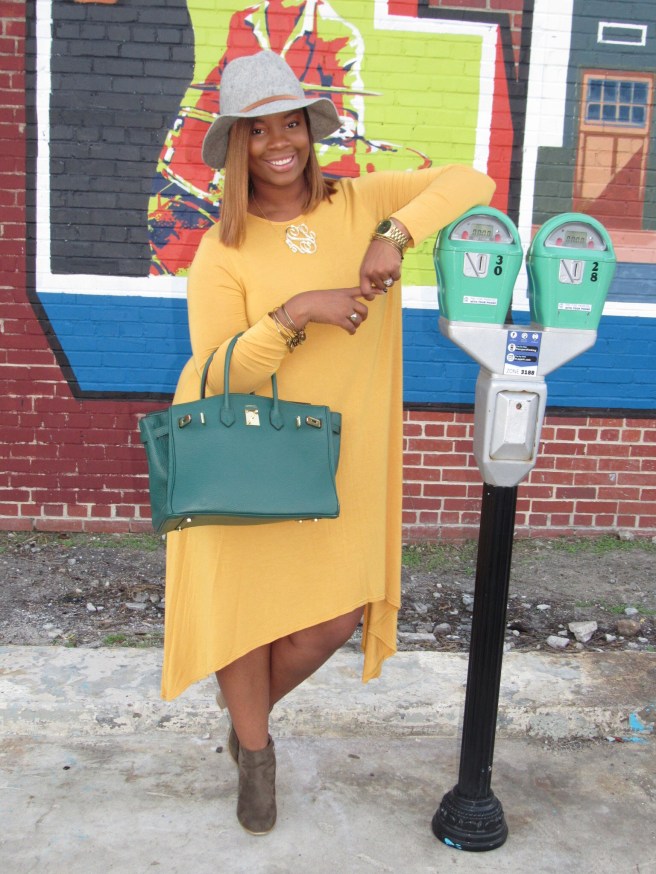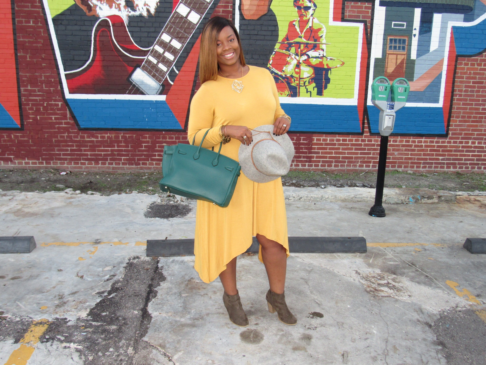 Well, hello there, sunshine! This midi, swing dress is from Boohoo and the boots are simple ankle booties from Old Navy in olive green. Yes, you can put different shades of green together as long there’s enough space between the two. Let me clarify; you do not want to have an olive green shirt with hunter green pants because these colors are then considered side by side. That would not be monochromatic. My purse is not beside or close to my booties. I am allowing space and creating color schemes from head to toe. It’s an art, if I do say so myself.
