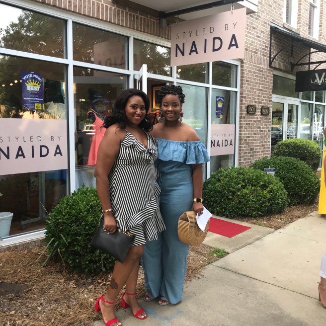 The kickoff to the week was being held at the store opening of Styled by Naida. This is a retailer that places emphasis on thrifting and re-inventing a look for a very affordable price. That’s my kind of gal. As I approached the event, I took notice of the red carpet laid out of the entryway and her huge sign showing the name of her store.
