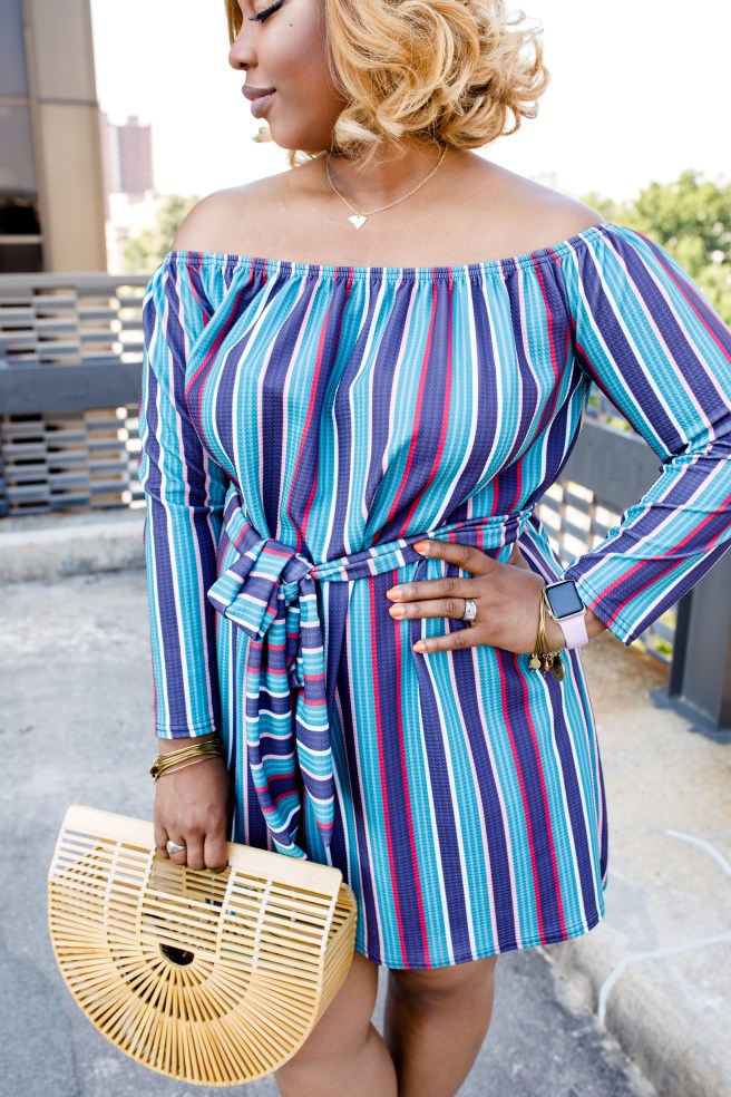 This Summer is all about color for me!! Thanks to Courtney’s commercials and Instagram (Color Me Courtney) I am yearning for more color! I am loving the crisp blue hues, the bright yellows, and the vibrant pinks this season! When I saw this dress I had to have it. The off the shoulder caught my eye, but the color scheme of the outfit sold itself!