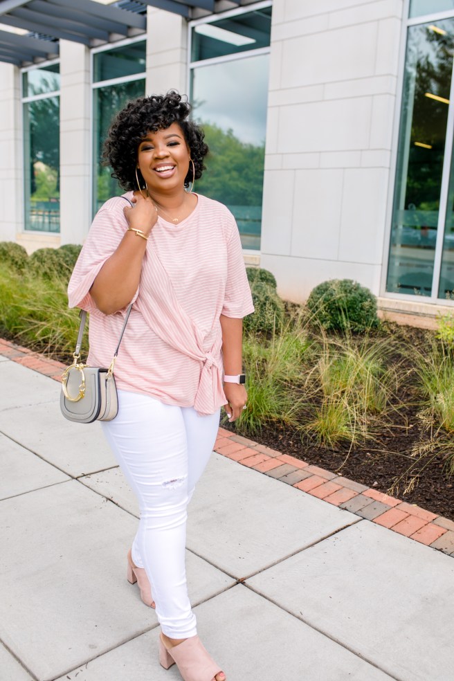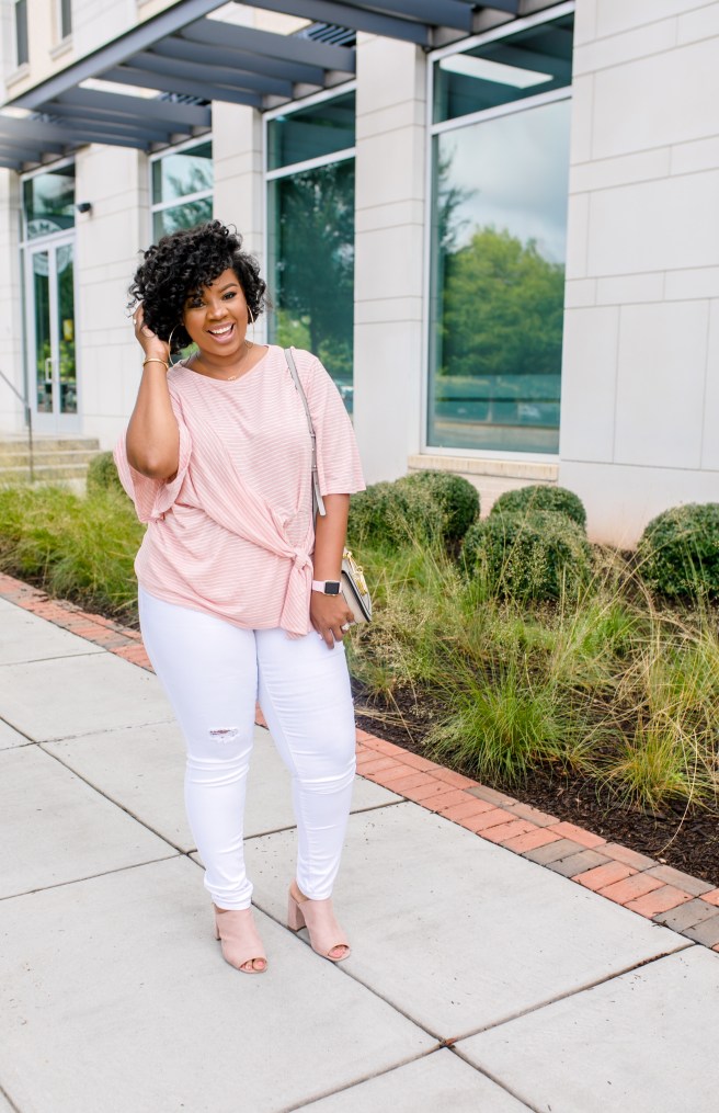 This is a size XL but I could definitely wear the large. The extra room simply makes it even more comfy. The knot is my favorite part because it adds that sassiness piece that I needed. Pairing this with my favorite white denim was a no brainer. My mules from Gabe’s was the perfect pink to compliment it!